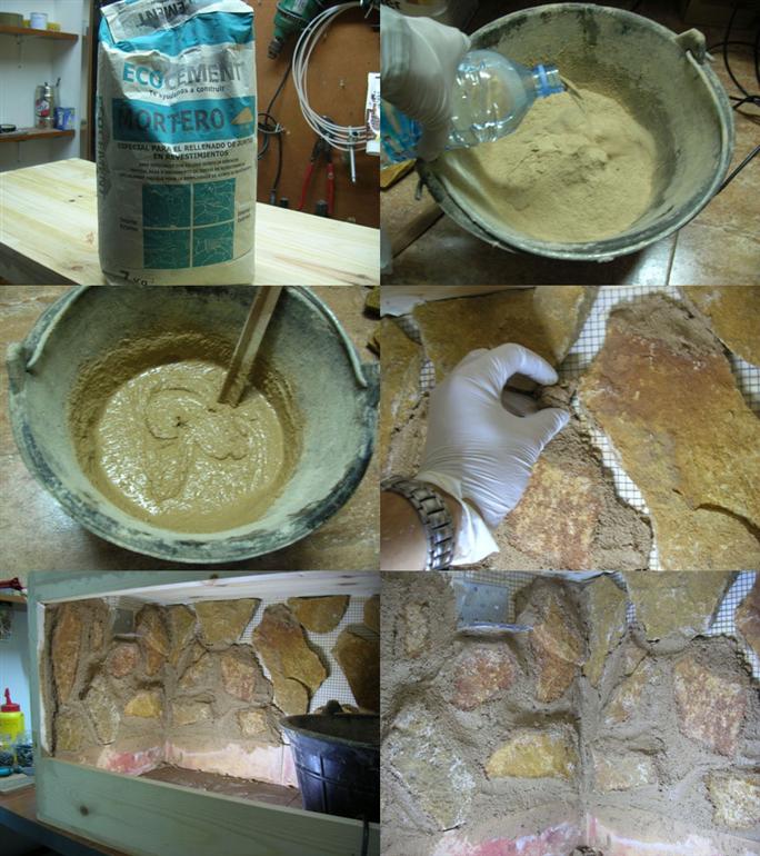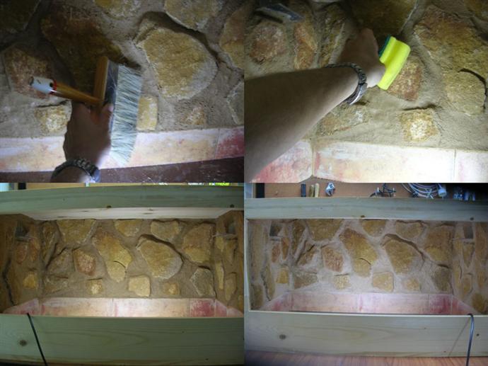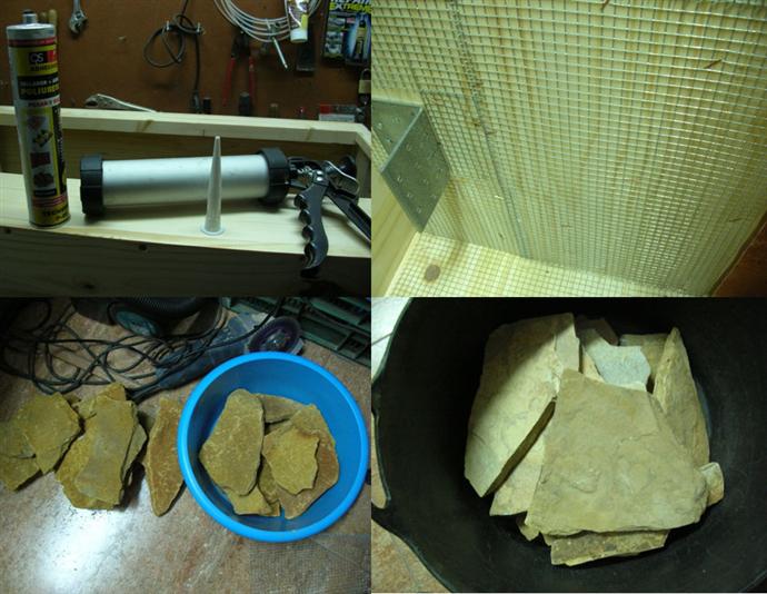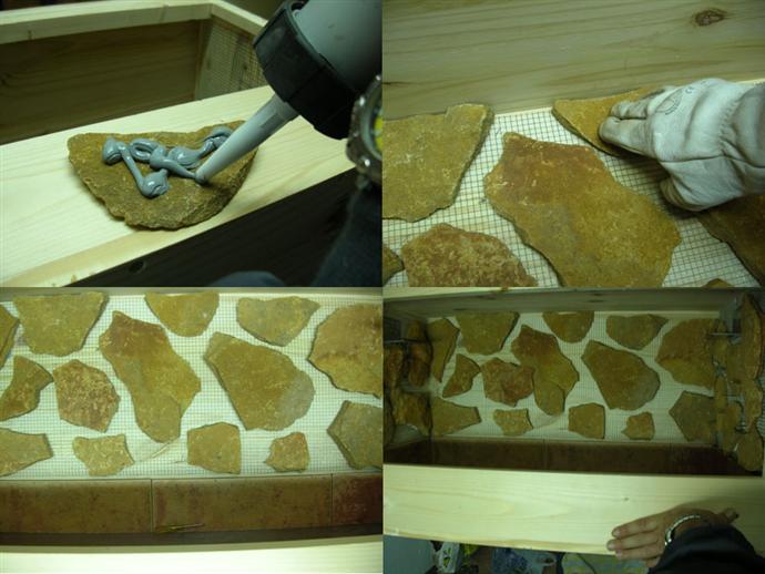 terrario, empezamos a pegar las lascas de piedra con la masilla de